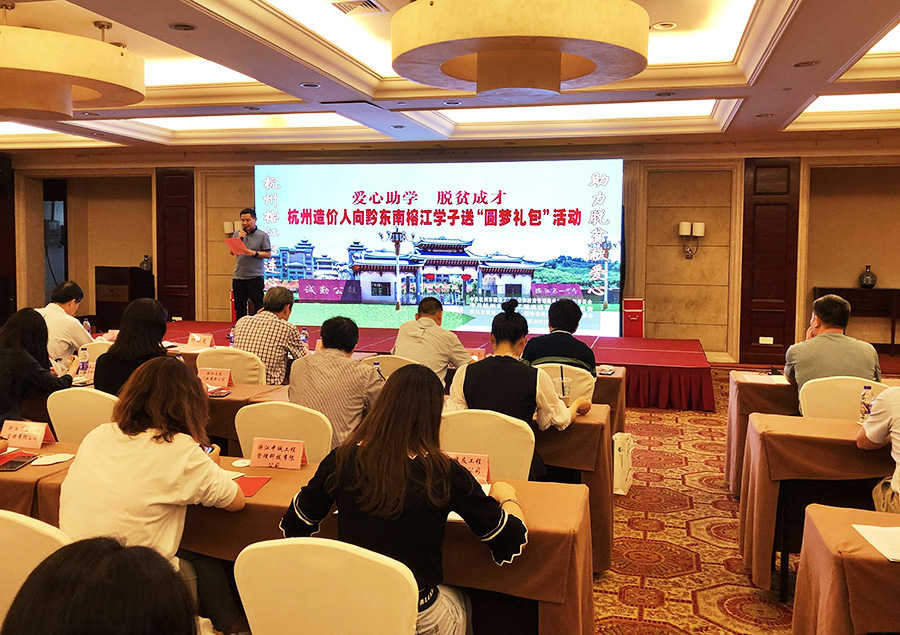 为贯彻落实日前省委常委、市委书记周江勇率杭州市代表团赴贵州省黔东南州榕江县落实扶贫协作工作座谈会精神,杭州市建设工程造价行业唱响“杭州榕江心连心,助力脱贫献爱心”的主旋律,在“六一儿童节”到来之际,杭州市建设工程造价和投资管理服务中心党支部、杭州市建设工程造价协会党委、关工委联合牵头,于2020年5月29日下午开展杭州造价人向黔东南学子送600份“圆梦礼包”助学成才活动。市关工委、市委组织部两新处、团市委、市文明办、市两新党务工作者协会、市社会组织管理局、省造价总站、市建委领导及54家企业代表近百人参加了本次活动。