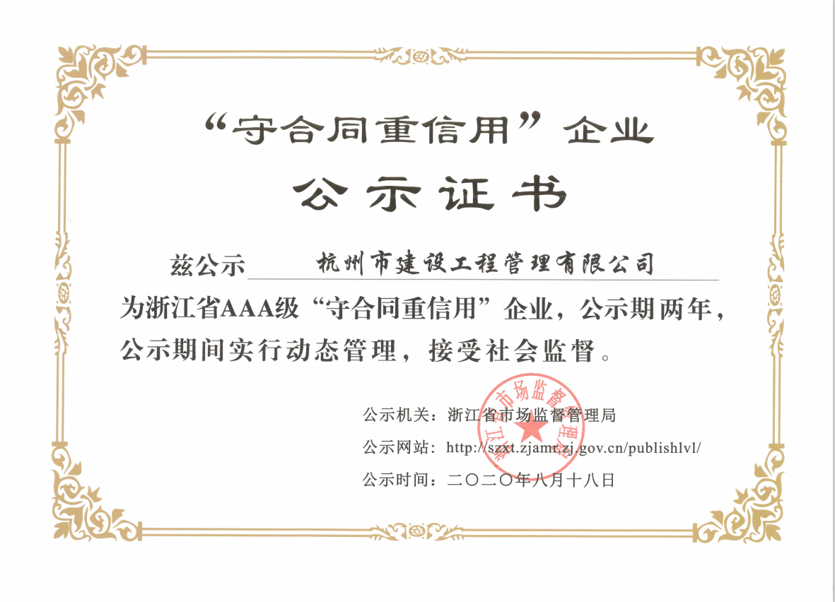 杭州市建设工程管理有限公司荣获2020年浙江省AAA级“守合同重信用”公示证书,不仅证实了杭建“不信不立,不诚不行”一诺千金的企业行为,而且证明了杭建人在砥砺前行的道路上工作井然有序与有条不紊,我们将坚持以严谨的工作态度、实事求是、科学公正的立场,致力于招标代理和造价咨询事业。公司全体员工衷心感谢广大新老客户对公司发展的支持和帮助!